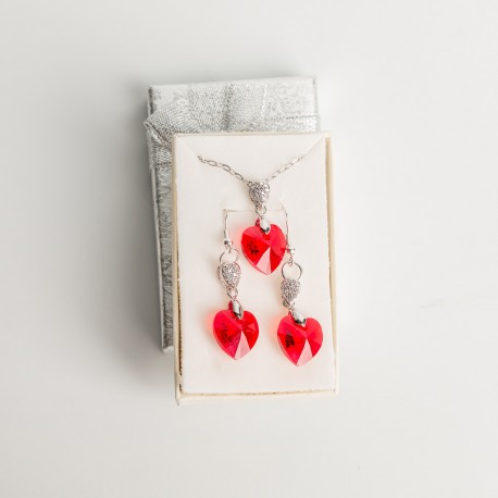 Juego de Collar y Aretes en corazón cristal Swarovski® 14mm. Color Light Siam (rojo) . Herraje plateado. Cadena 45 cm
